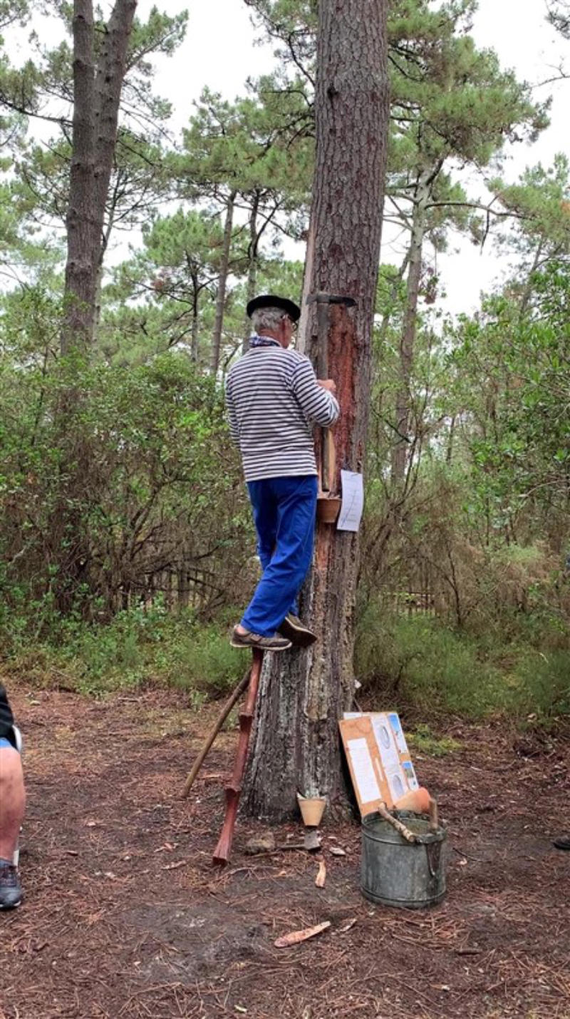 L'après-midi, nous partons en covoiturage pour rencontrer l'équipe des gemmeurs qui effectuent des saignées dans les pins pour provoquer l'écoulement de la